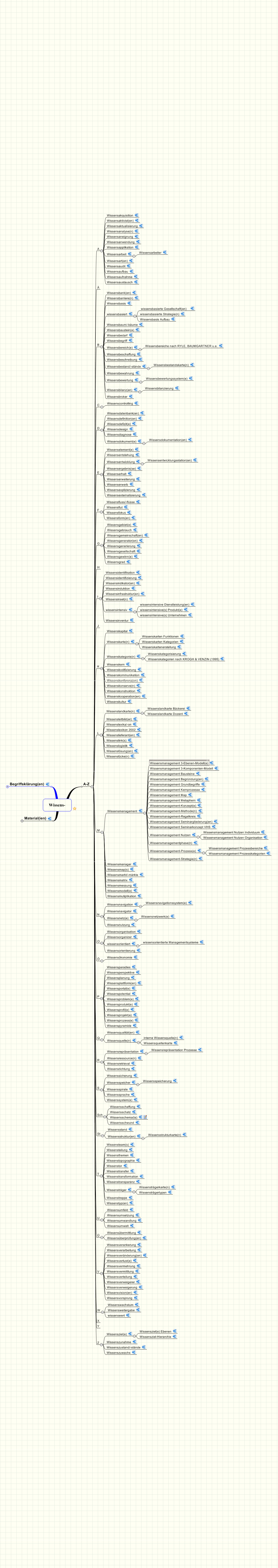 Bei zusammengesetzten Begriffen, die am linken oberen Ast ("Begriffsklärung(en)" > "Begriffswurzel(n)") in trunkierter (aufgespaltener) Form angefügt sind (z.B. "Wissensmanagement" ist aufgeteilt in " Wissens-" und "-management"), entwickelt sich mit der Zeit u.U. eine umfangreiche Sammlung von Übersichten.
